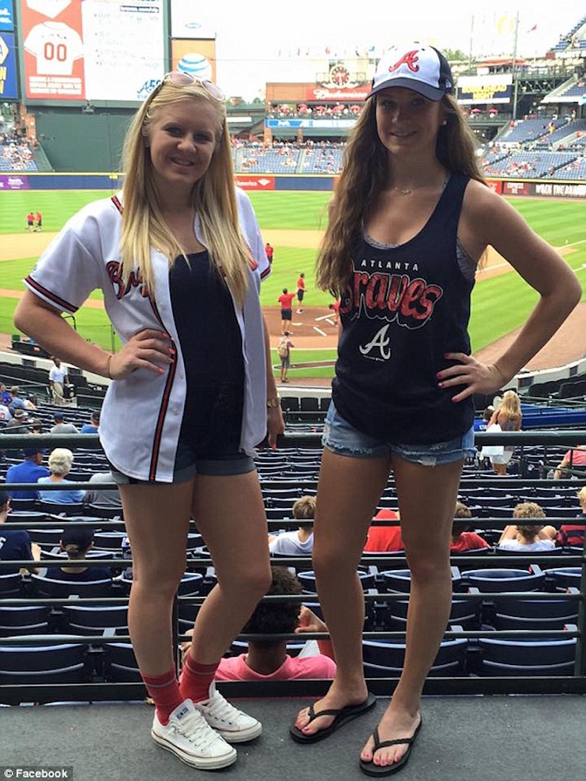 Two sisters, Delana and Brynn, attended an Atlanta Braves game at Turner Field. They were seated directly behind a married couple wearing hats and matching red shirts.